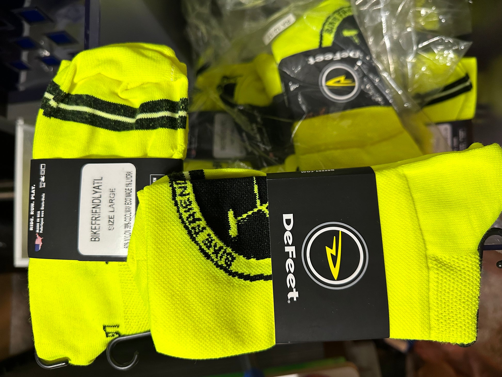 These High visibility yellow cycling socks are made by DeFeet and are the highest quality cycling socks. Get them while supplies last and make sure you’re visible at all times with these bright socks!!!